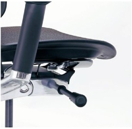 ●前傾チルト機能・リクライニング固定機能 座面左側前方のレバーを下げると背面と座面が前傾にチルトするため、背面へのフィット感が増します。背面を任意の角度まで傾斜させた状態で、座面左側後方のレバーを下げるとリクライニング角度を固定することができます。 |